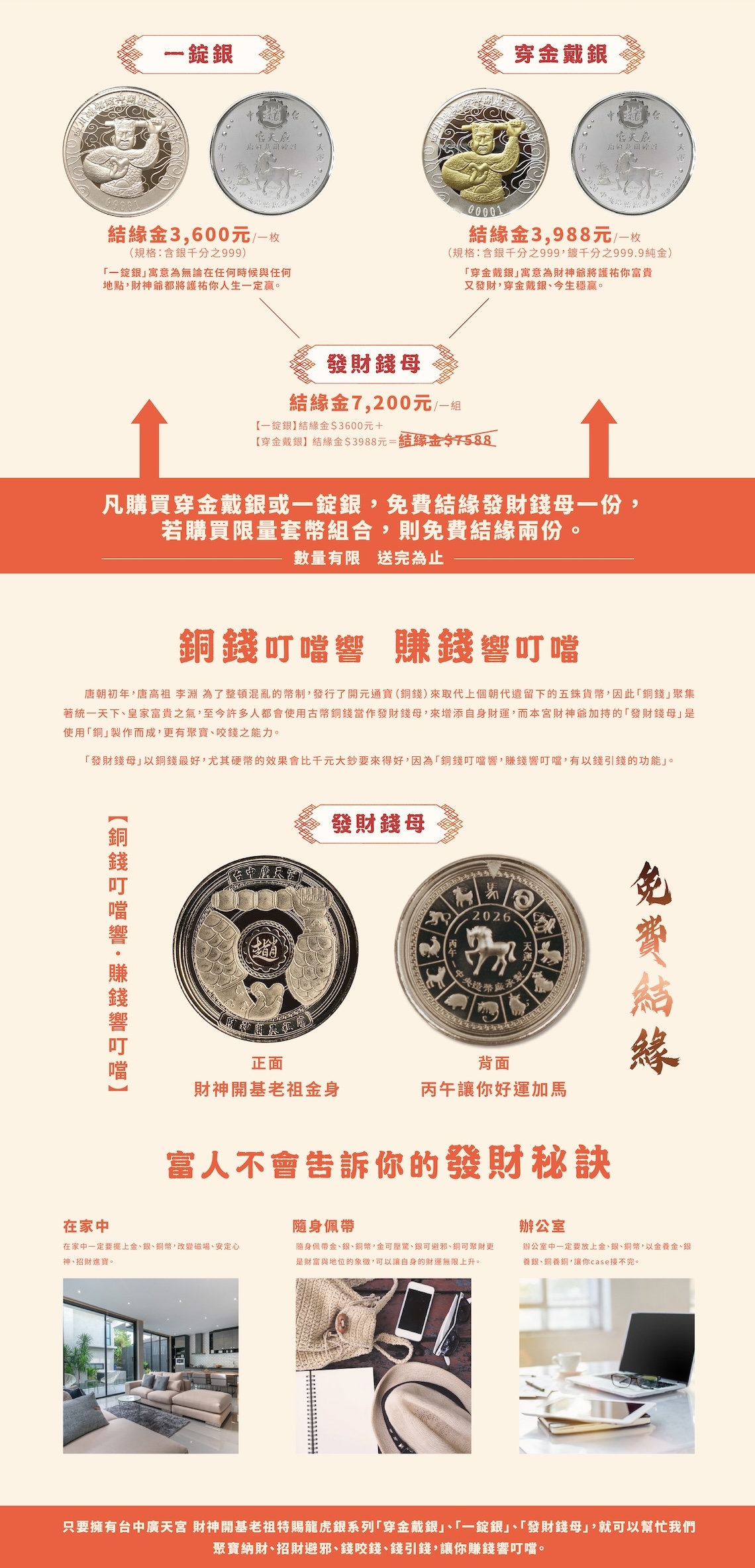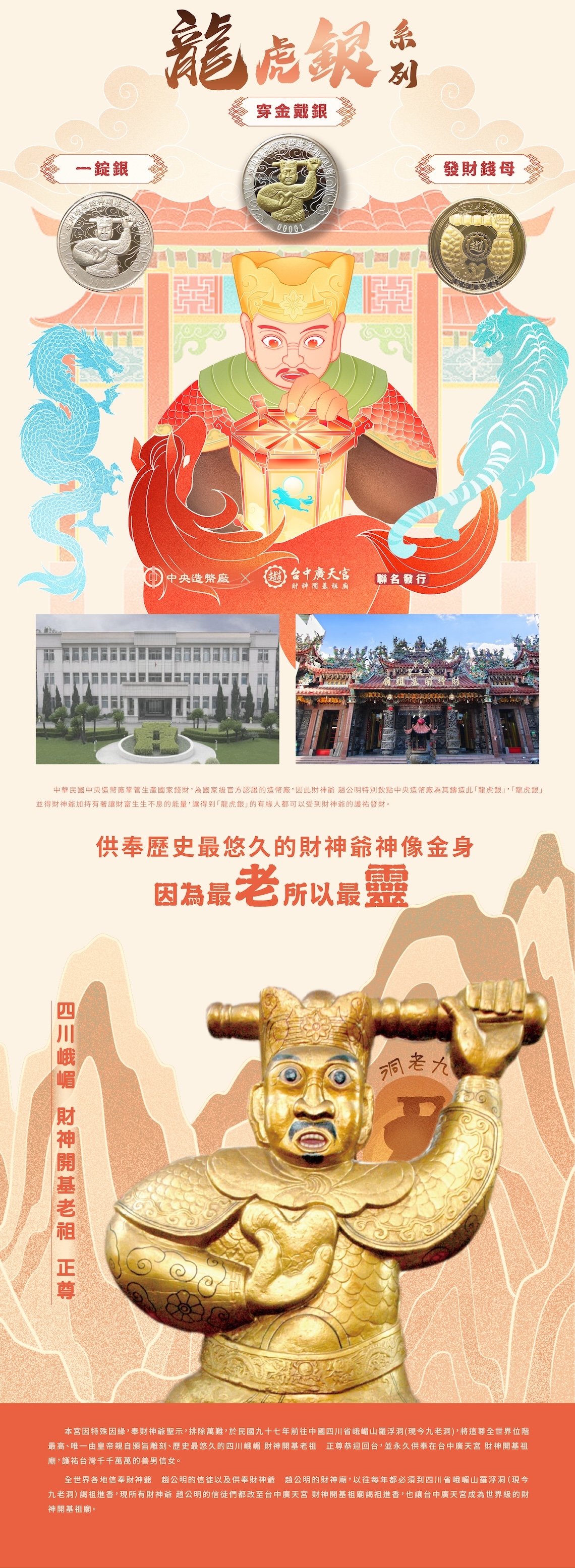 台中廣天宮與中華民國中央造幣廠限量聯名發行「穿金戴銀」,財神爺開壇演化加持,有如眾神護持,護佑穿金又戴銀!
