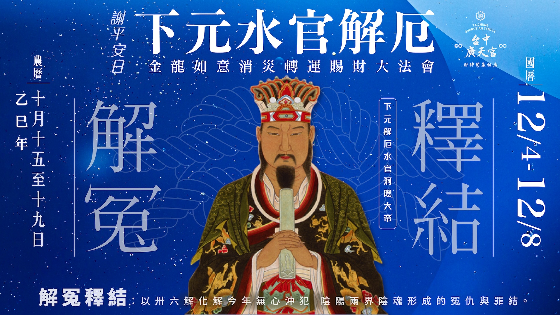 因為財神爺趙公明記載三界「功與過」,為此,台中廣天宮於下元節特別舉辦「金龍如意消災轉運賜財大法會」,恭請財神爺趙公明開壇演化主持公道,讓參加法會的信眾可以消災轉運又賜財。